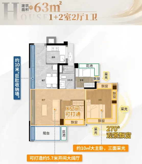 建面约63-82㎡的三房单位,全部精装修交付,实用率均超100%,最高达107%,在同区域产品中极具竞争力。