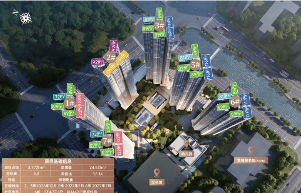 ,由6栋47层高塔楼组成,最大限度围合出中心园林景观。其中2#楼为“楼王”,两梯四户,主力户型92-159㎡;其余楼栋为三梯六户,户型涵盖81㎡、89㎡、116㎡,满足刚需与改善多元需求。
